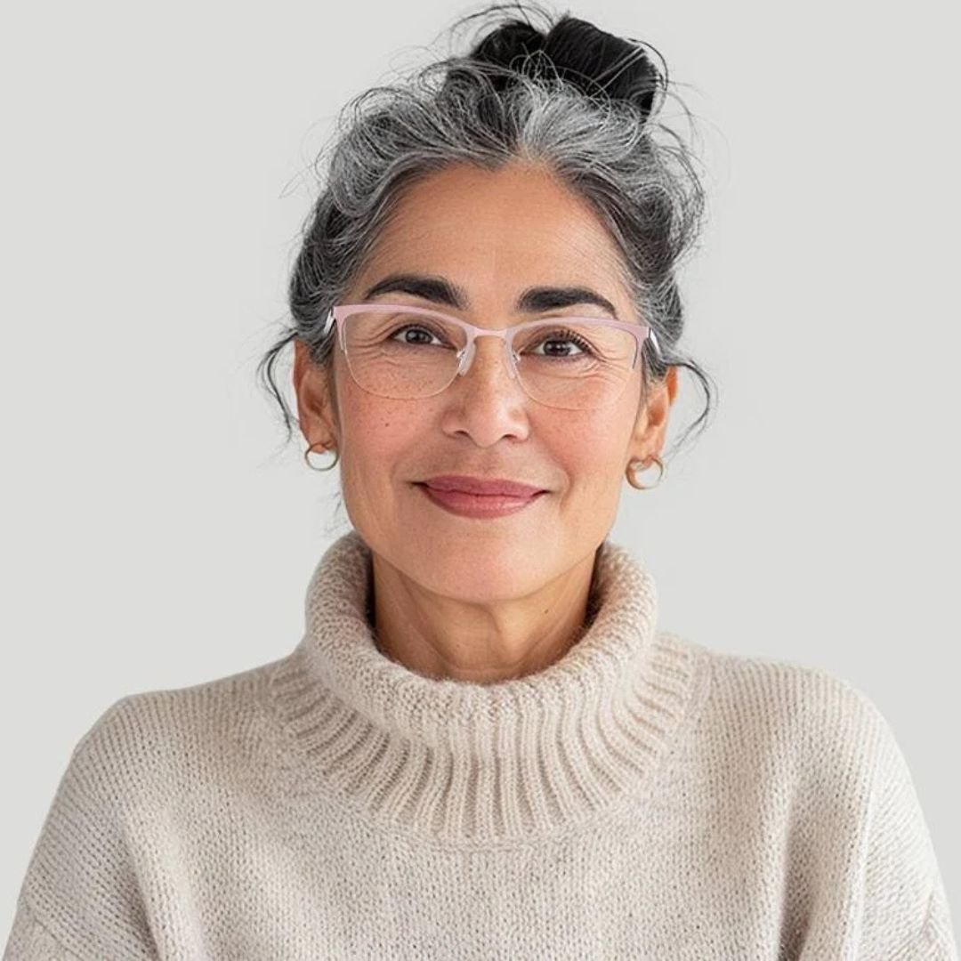 Refine your everyday and professional look with these women’s rectangle half-rim prescription glasses, designed with a lightweight stainless steel frame for lasting comfort. Featuring a slim, narrow fit and retro-inspired styling, these eyeglasses include patterned frame details and comfortable nose pads for a secure, all-day wear experience. Blue light filtering prescription lenses help support visual comfort during screen use at work or home.